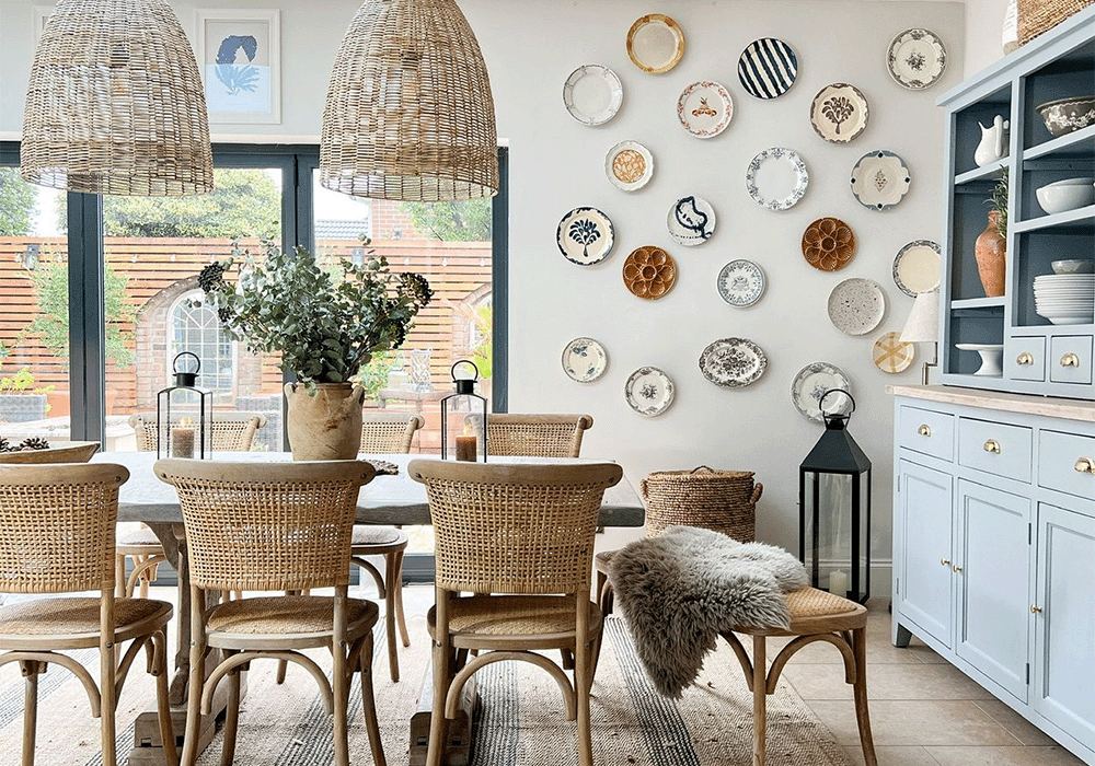 Po co trzymać swoją wykwintną porcelanę ukrytą w szafce, skoro można ją wyeksponować? Użyj drucianych wieszaków na talerze, aby zaprezentować swoje ulubione talerze i półmiski. Może to być właściwy wybór, jeśli jesteś kolekcjonerem wszelkiego rodzaju obiektów projektowych — płytki prototypowe były nawet używane jako części.