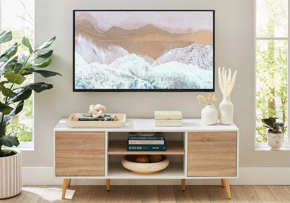 Alternatywny sposób działania? Umieść telewizor na uchwycie. Jednym z najlepszych sposobów na poprawę wyglądu ściany, zwolnienie miejsca nad szafką multimedialną i zmianę całej estetyki salonu lub sypialni jest zamontowanie na niej płaskiego ekranu. Ponadto telewizory takie jak odpowiednio nazwany „The Frame” są projektowane tak, aby w stanie wyłączonym przypominały dzieła sztuki. Dzięki Samsungowi możesz wyświetlać wybrane obrazy na telewizorze w trybie otoczenia.